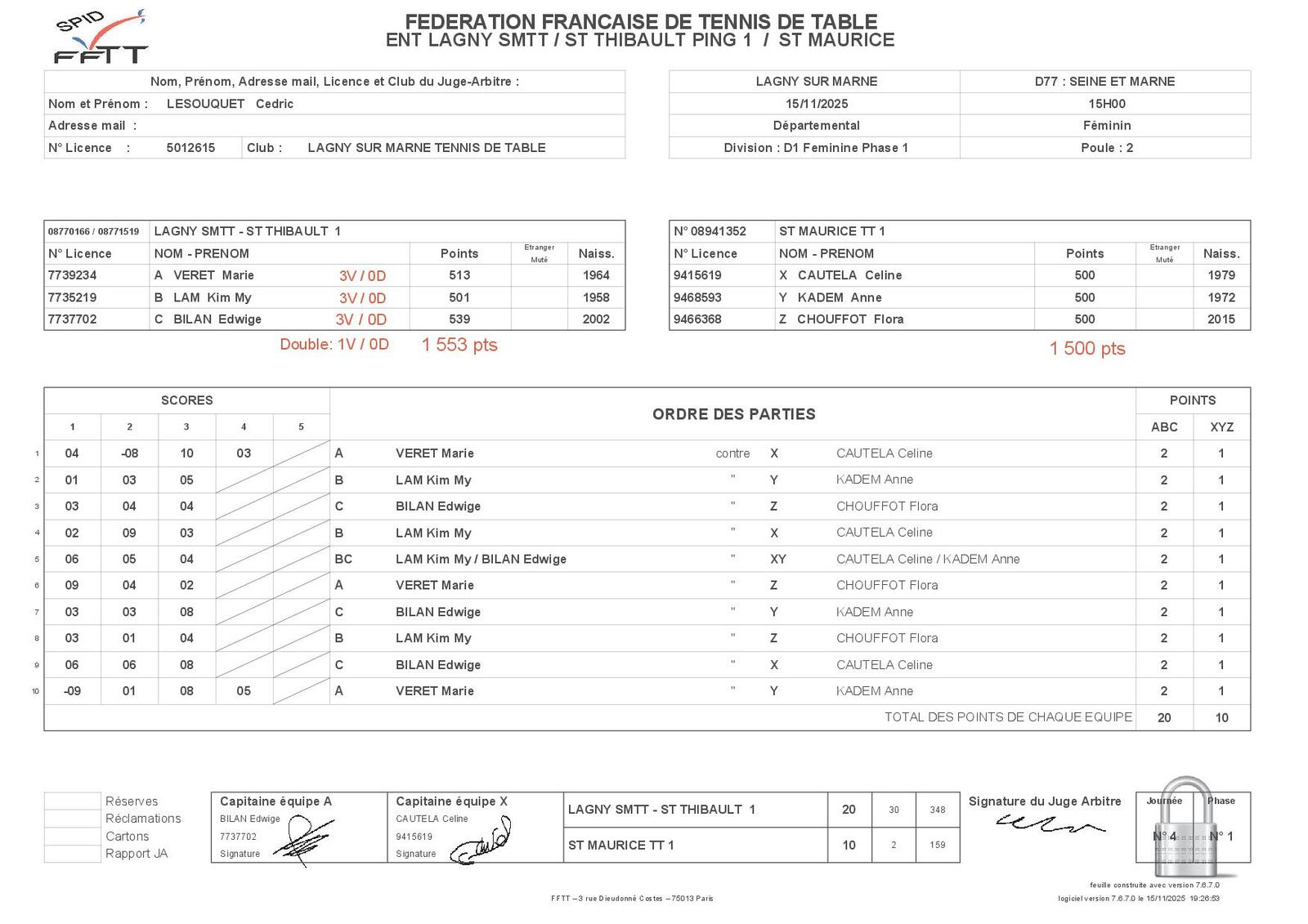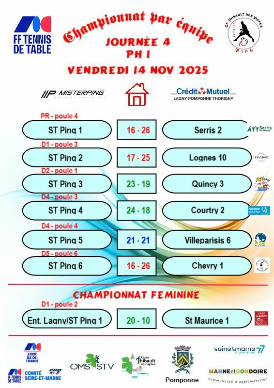 La 4ème journée du championnat par équipe s'est déroulée ce vendredi 14 novembre 2025 à Saint-Thibault-des-Vignes et à Lagny-sur-Marne. Sept de nos équipes étaient en lice avec des résultats variés.