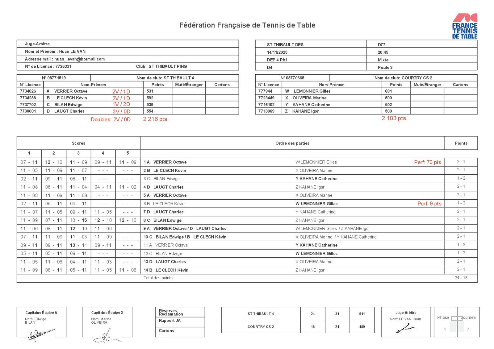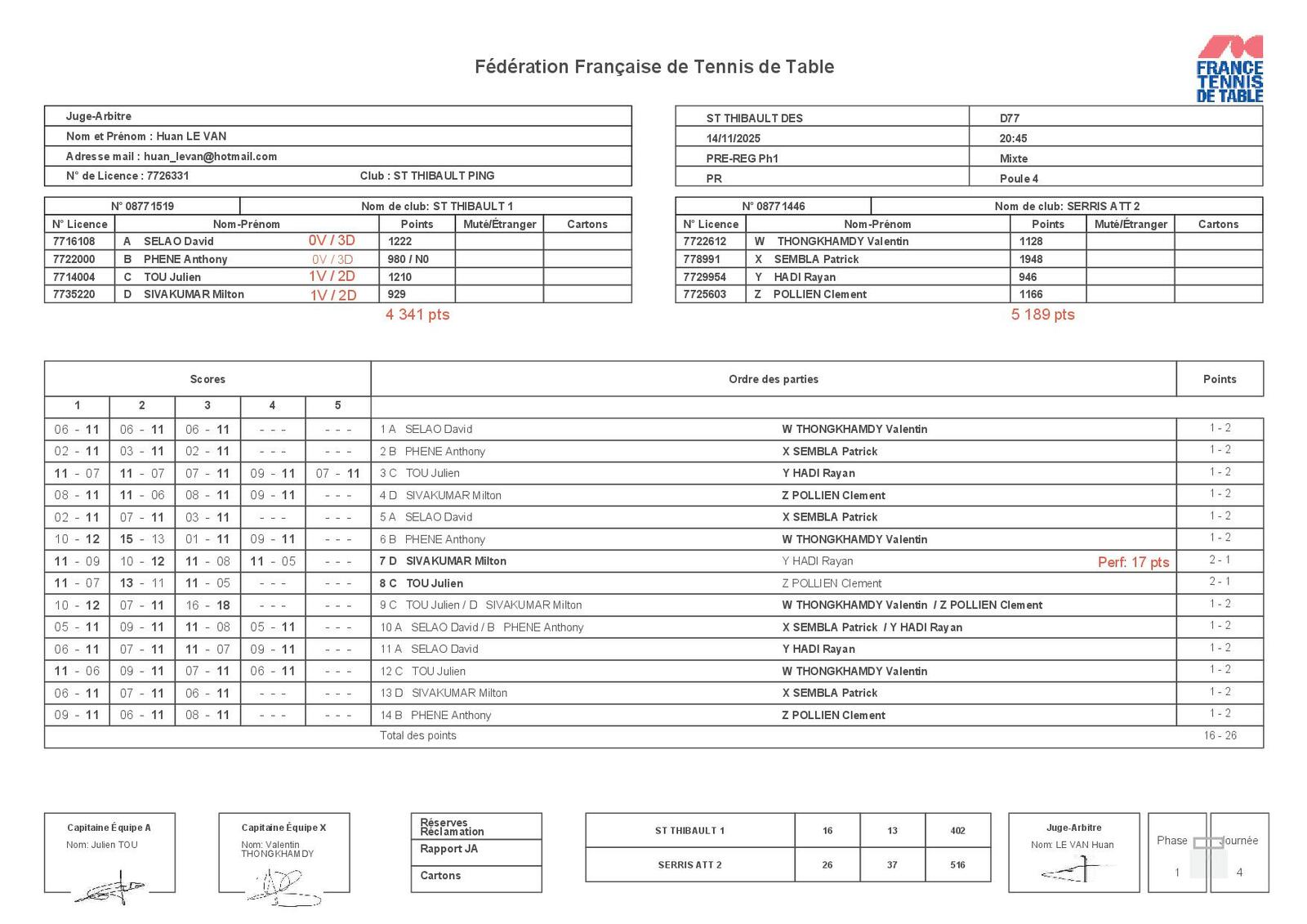 Analyse : Très belle victoire de l'équipe 4 menée par un Charles LAUGT impérial qui réalise le sans-faute (3V/0D). Octave VERRIER apporte également deux points précieux. Le secteur doubles est parfaitement maîtrisé avec deux victoires qui ont fait la différence. Edwige BILAN, capitaine de l'équipe, a su mobiliser son équipe pour décrocher cette victoire importante.