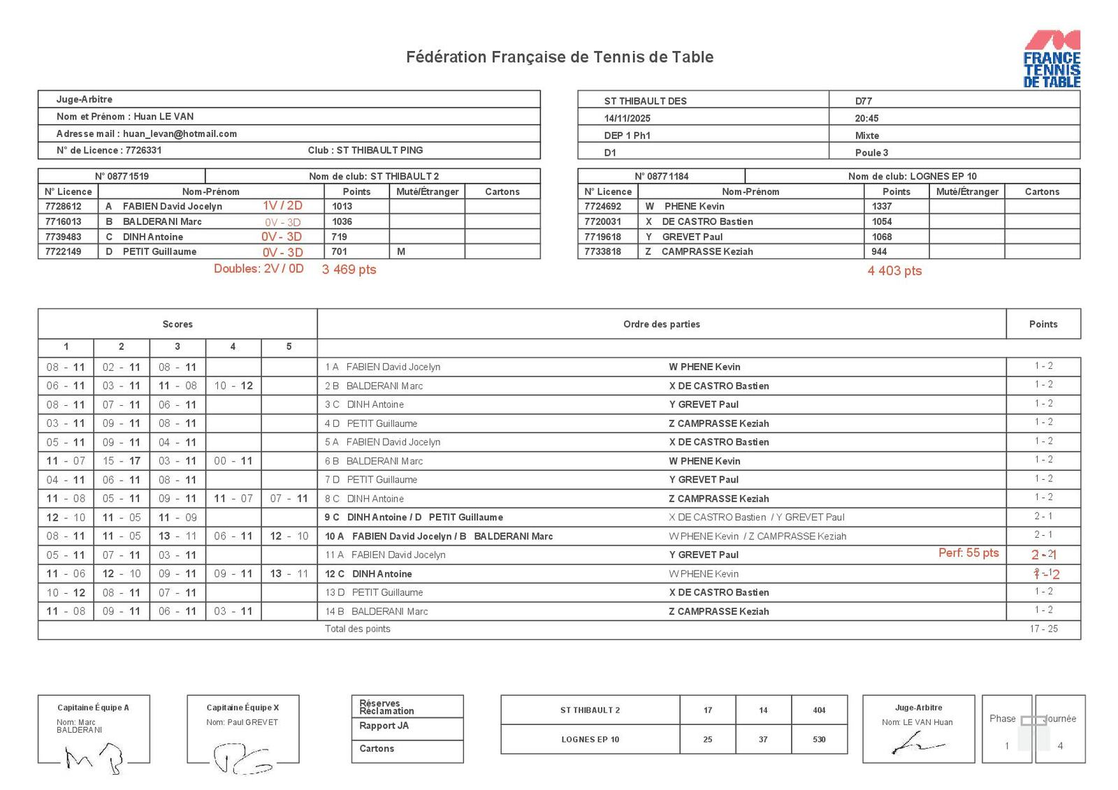 Analyse : Malgré la défaite, il faut souligner l'excellente performance de David FABIEN qui réalise une belle perf à 55 pts. Le secteur doubles sauve l'honneur avec deux victoires précieuses signées DINH/PETIT et FABIEN/BALDERANI. Face à une équipe de Lognes bien en place, nos joueurs ont manqué de régularité en simple.