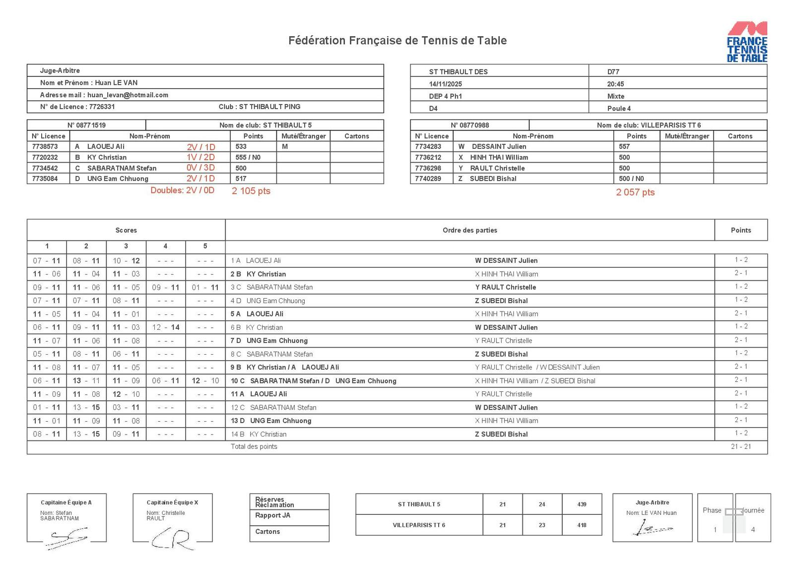 ST THIBAULT 5 (D4 - Poule 4) : Match nul 21-21 contre VILLEPARISIS TT 6 ⚖️