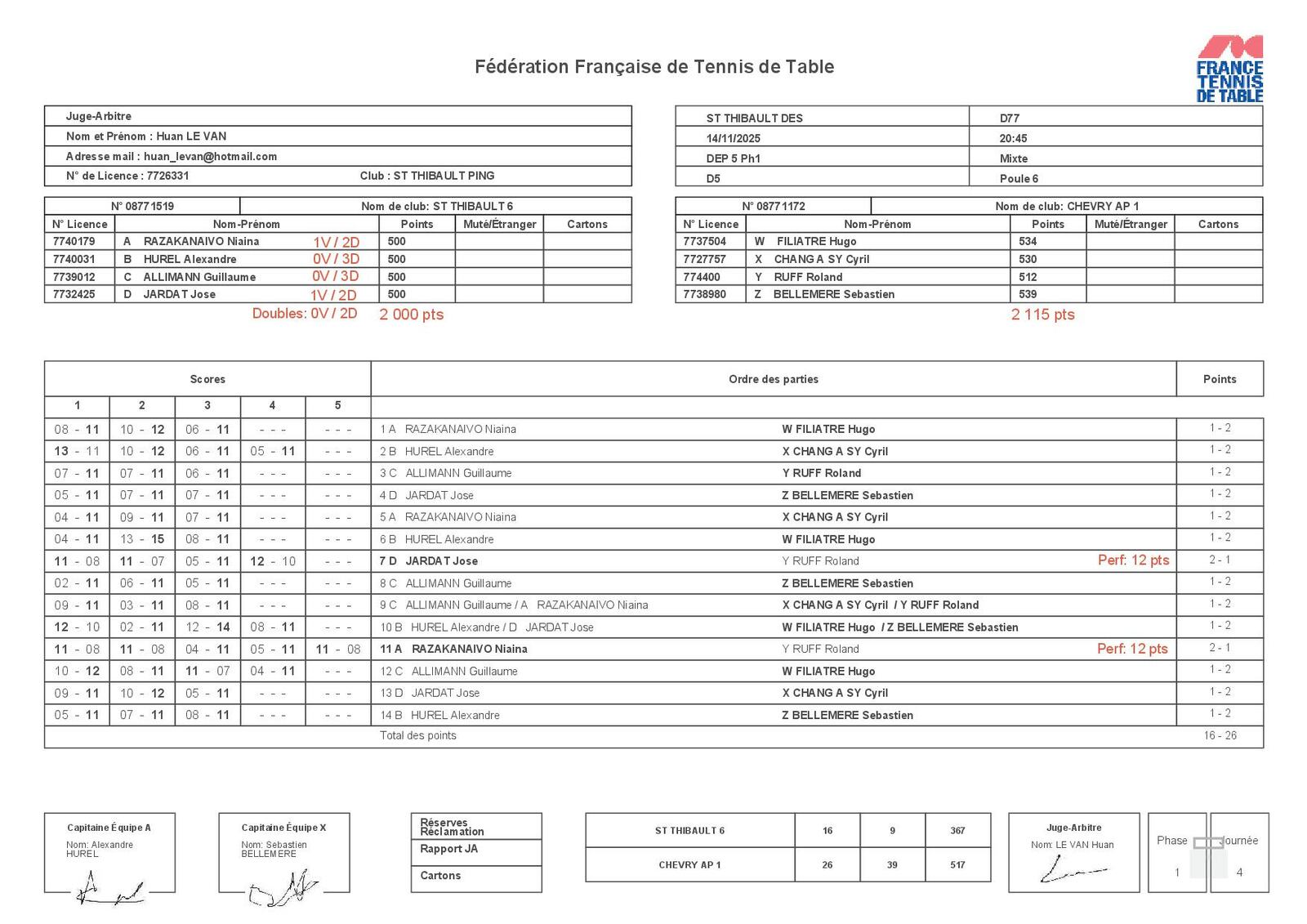 Analyse : Match difficile pour notre équipe 6 face à une formation de Chevry bien supérieure (2115 pts contre 2000 pts). Seuls Niaina RAZAKANAIVO et Jose JARDAT ont réussi à décrocher une victoire chacun. Les doubles n'ont pas permis de recoller au score. Une soirée compliquée mais l'équipe a montré du caractère.