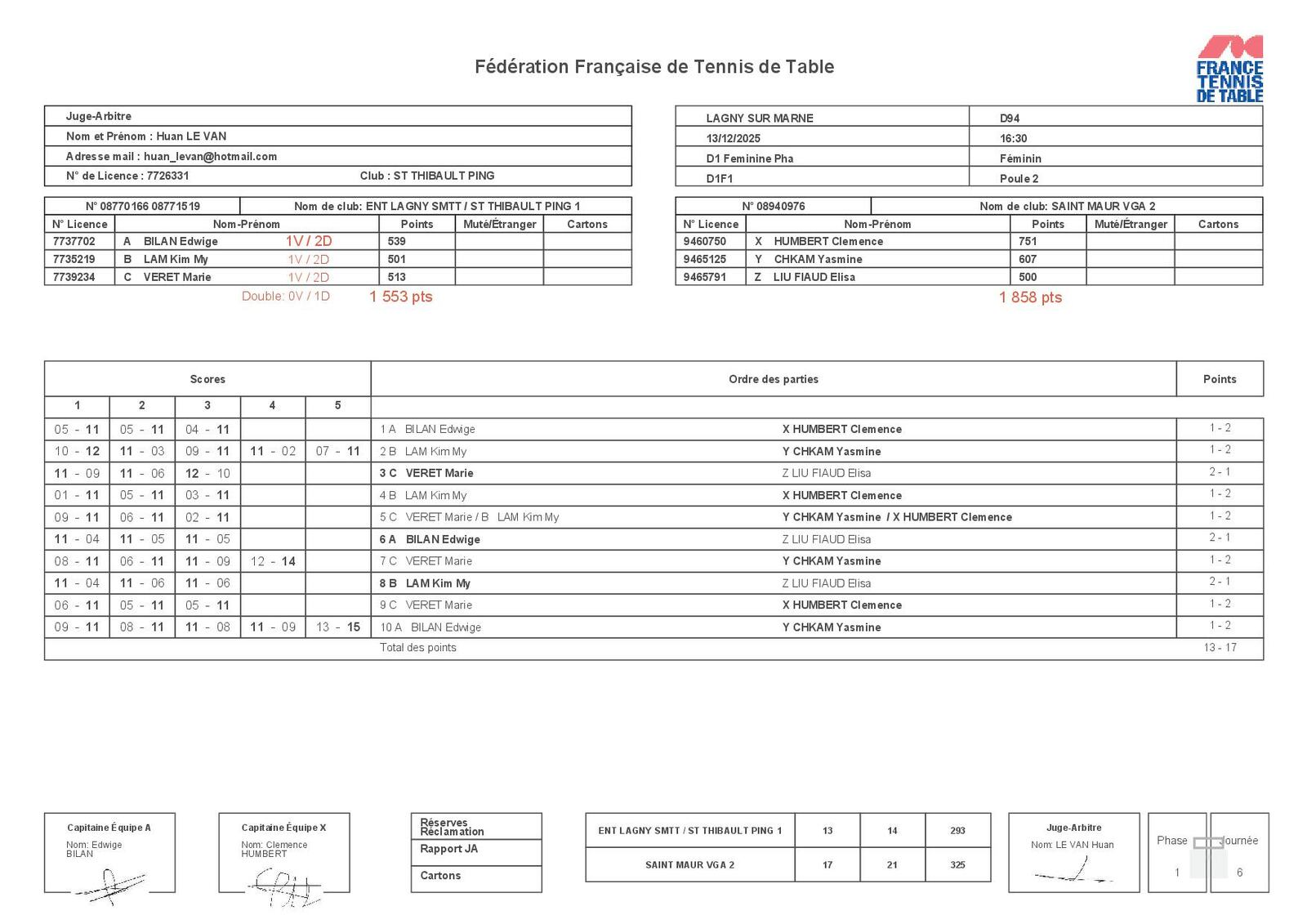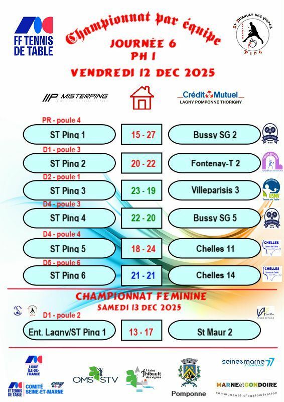 - Conséquence : montée envisageable en Régionale Féminine pour la phase 2, sous réserve de confirmation par la ligue et que St Maur TT 2 perd leur dernier rencontre.
