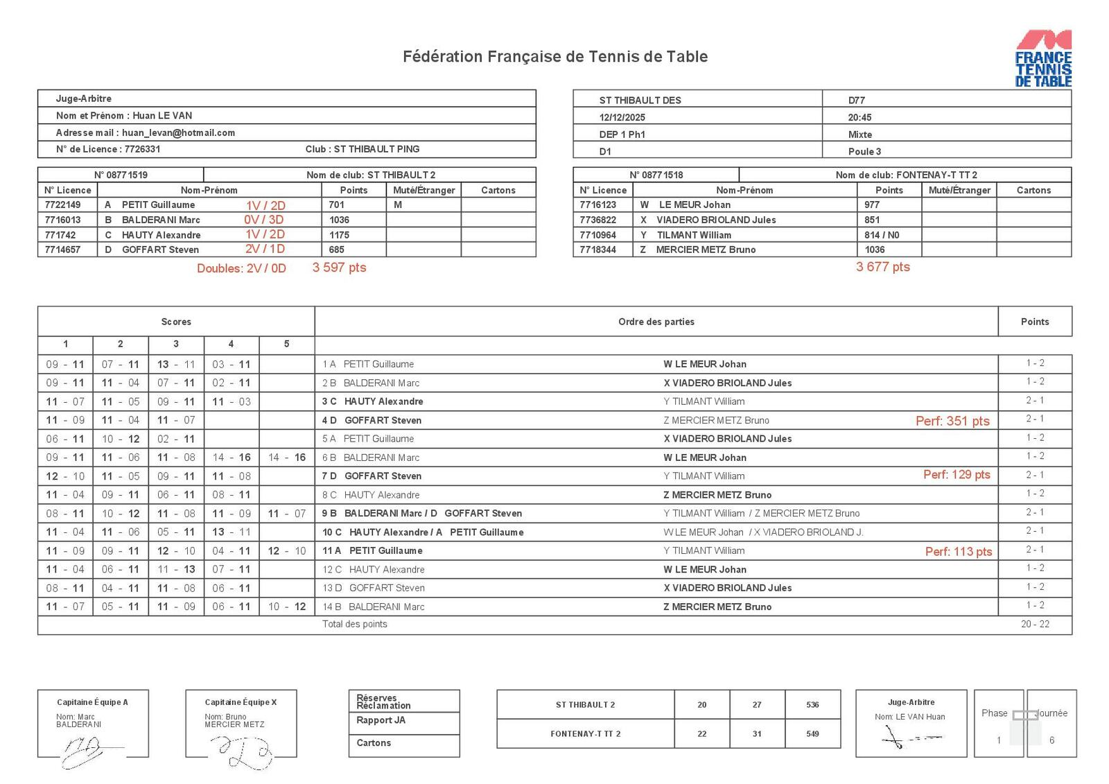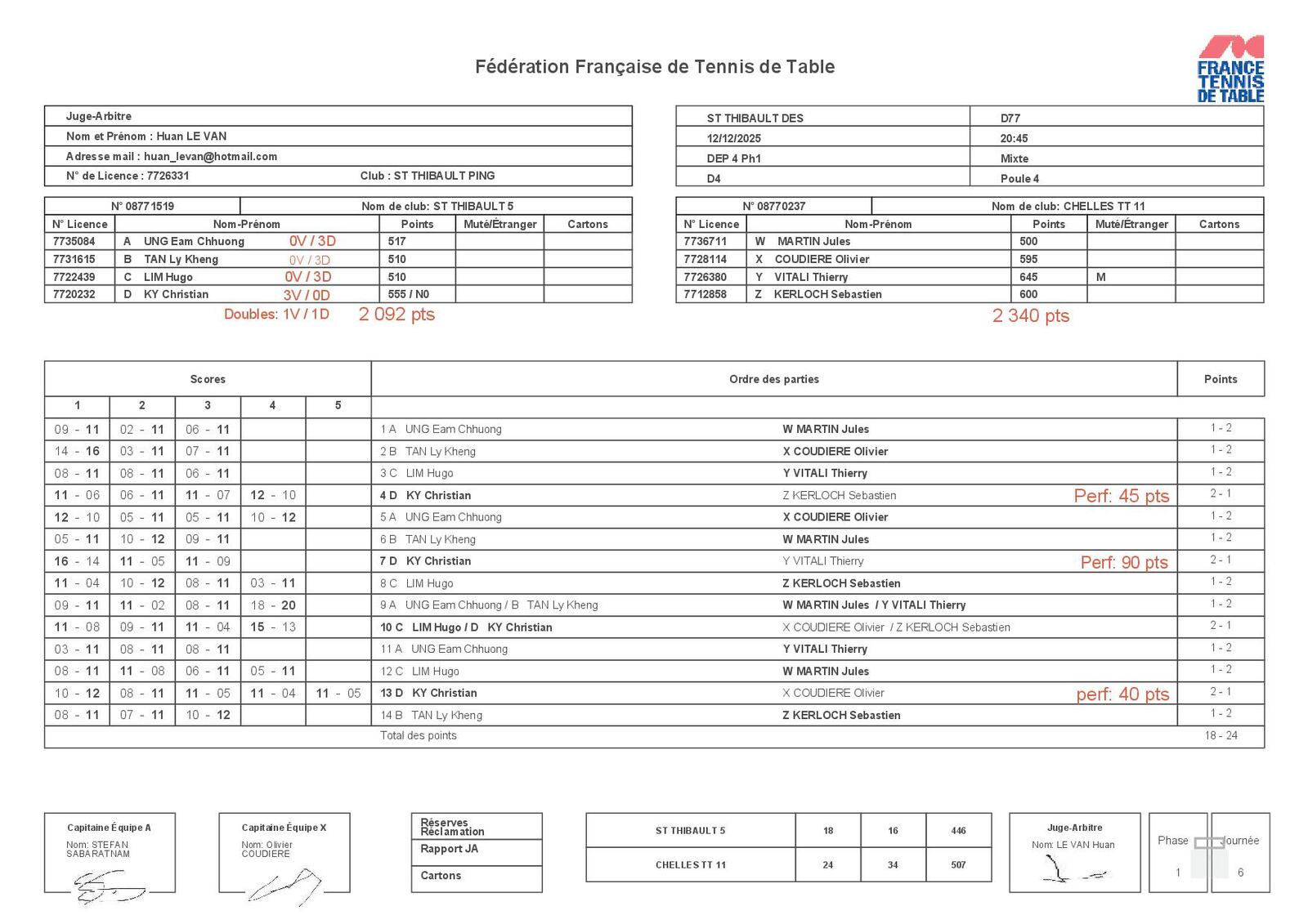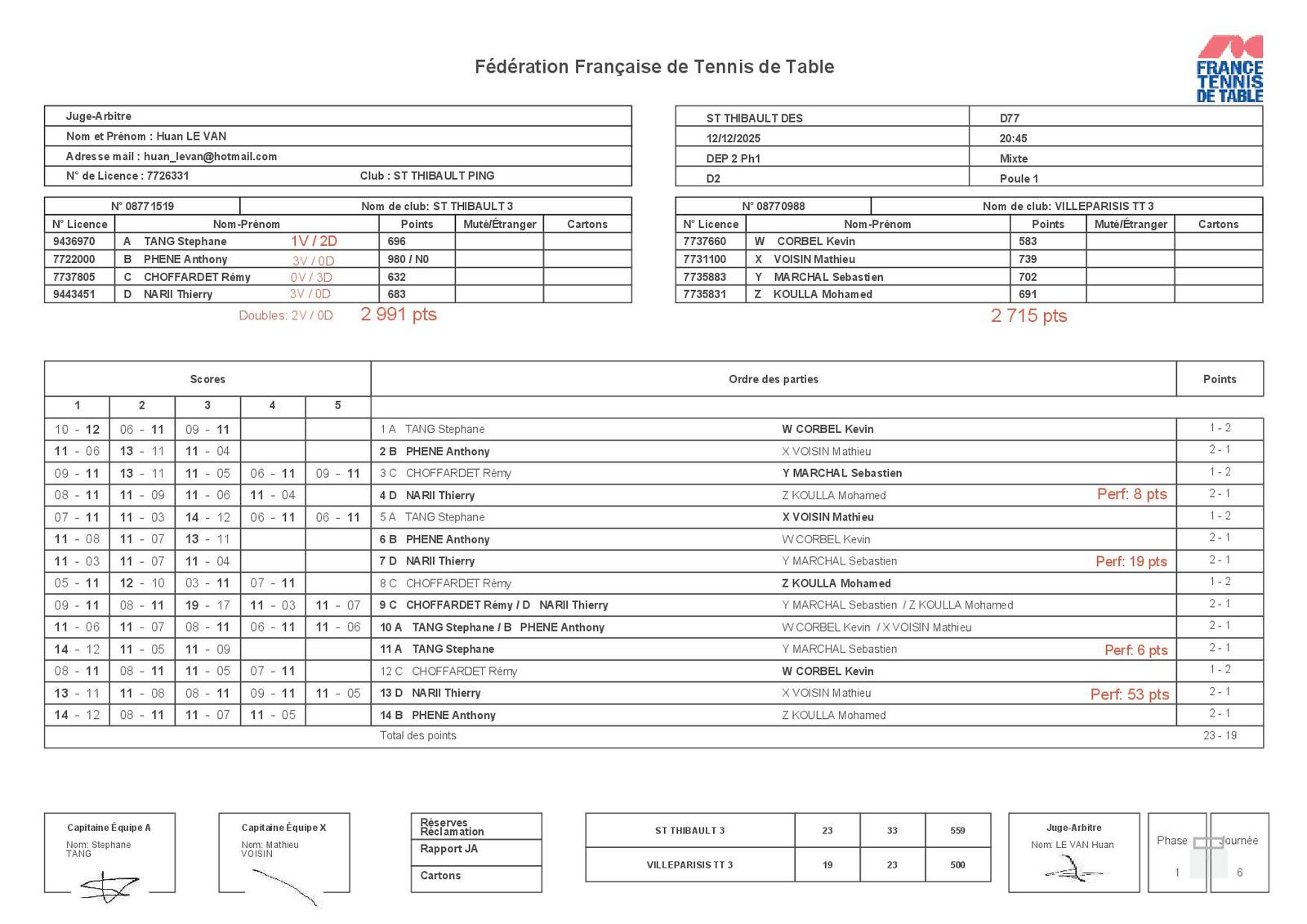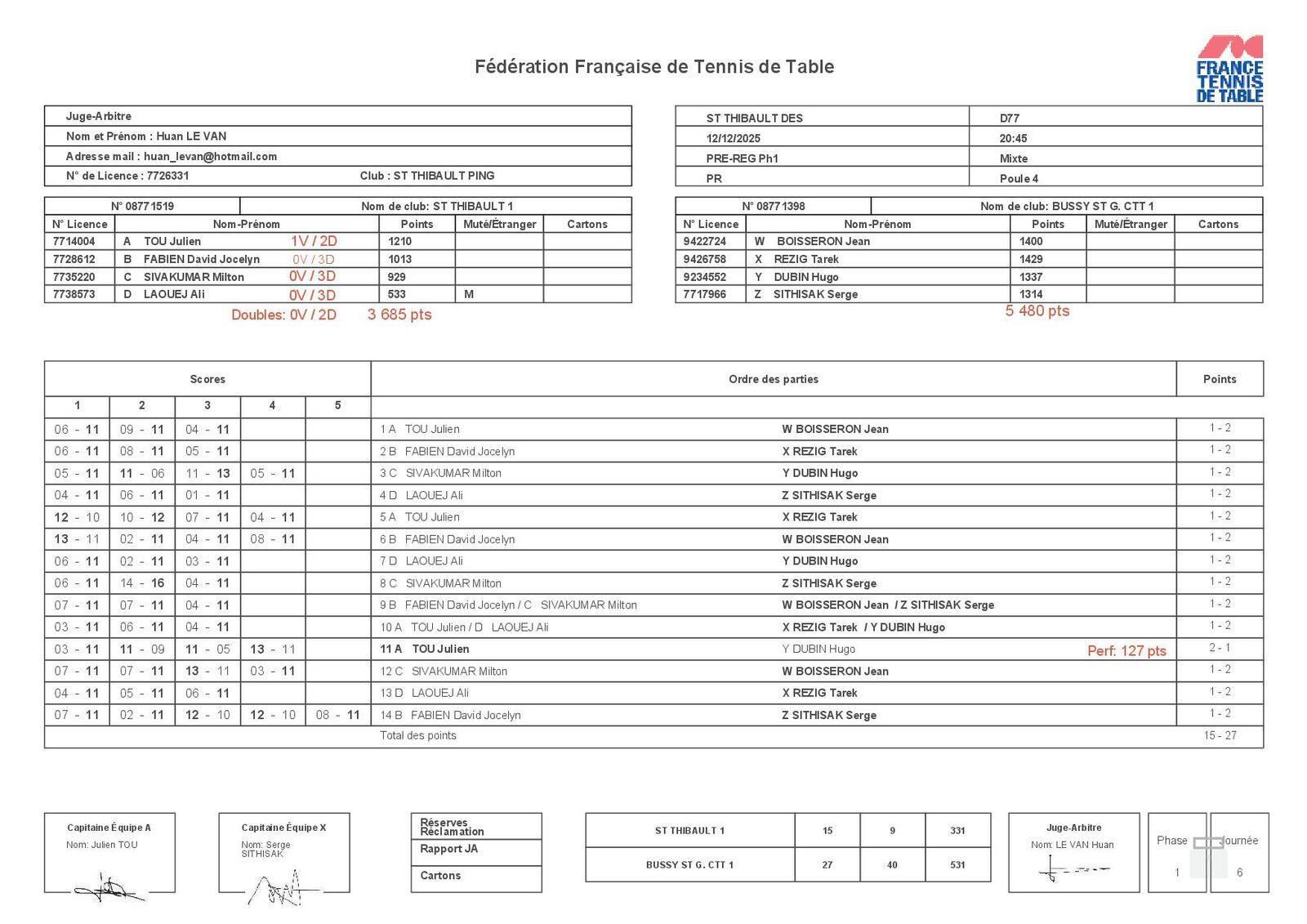 - Point fort : Anthony et Thierry en duo gagnant, chacun 3/0, plus des perfs (+53, +19, +8). Doubles solides (2/2) qui font la différence.