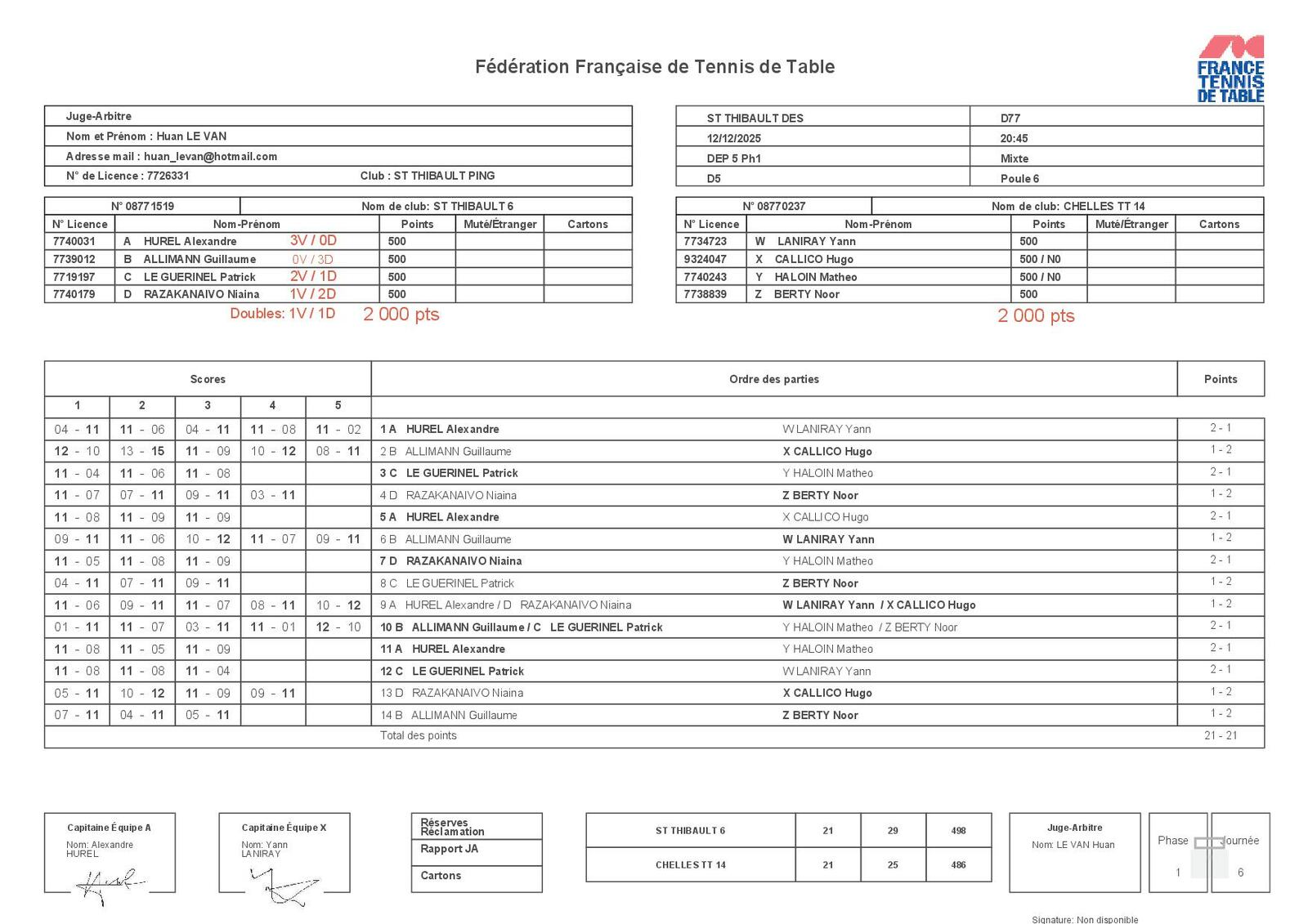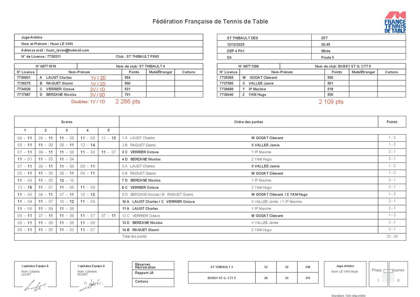 - Point fort : Alexandre parfait (3/0) et Patrick fiable (2/1); bonne réaction en double (B/C) pour arracher le nul dans une rencontre très équilibrée.